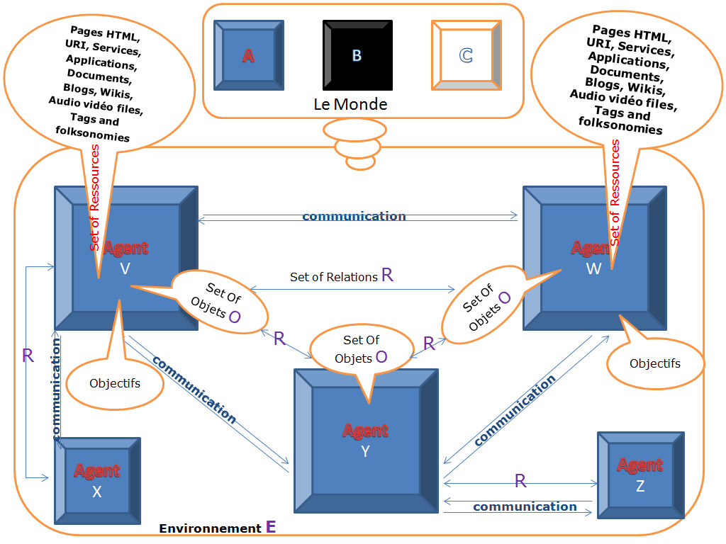 Dans un SMA, chaque agent évolue dans un environnement limité, celui qu’il est capable de percevoir. Sur le Web, les agents humains, tels que les membres d’une communauté ou artificiels tels que les navigateurs Web sont clairement différenciés des ressources qui sont des éléments de l’environnement dans lequel ils évoluent.